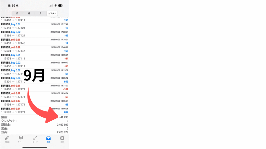 | 9月 | −41,730円 | −13.9% | 約−2,454円 | 17日間 | Butterfly史上初の連続マイナス。まだまだ充分プラスだが、巻き返しを期待。 |